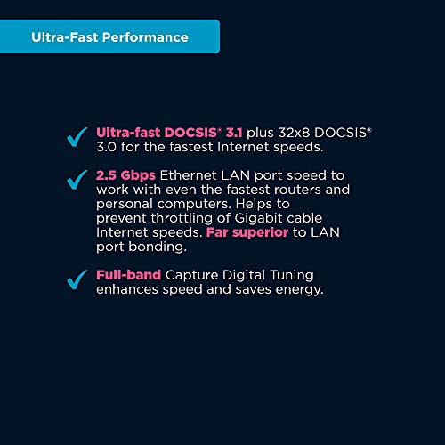 Rendimiento DOCSIS 3.1 ultrarrápido: el modelo MB8611 admite los servicios de cable módem DOCSIS 3.1 más rápidos disponibles para todos los niveles de velocidad multigigabit, con respaldo a DOCSIS 3.0 de 32×8 (aprobado por Comcast Xfinity para todas las velocidades, incluidos los servicios Comcast Gigabit)