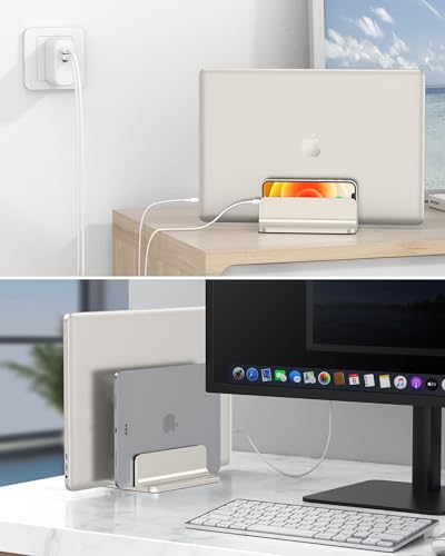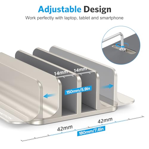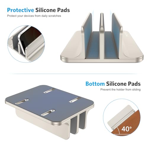 Especificaciones: OMOTON Soporte vertical para laptop [versión doble actualizada], soporte de aluminio para Mac Book de escritorio con tamaño de base ajustable, se adapta a todos los Mac Book, Surface, Chrome Book y