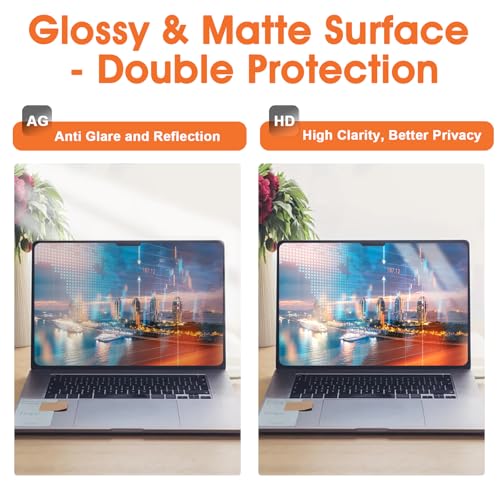 Contiene tanto mate como brillante: doble protección con un lado mate y un lado brillante. Puedes utilizar el lado mate para evitar el deslumbramiento y el reflejo durante el día cuando hay mucha luz. Puedes utilizar el lado HD para una visualización más clara por la noche cuando la luz está baja. También ajusta el brillo de la pantalla según sea necesario, protege la privacidad de tu portátil durante todo el día.