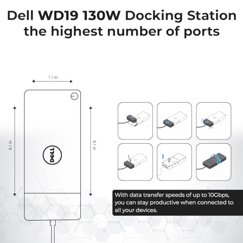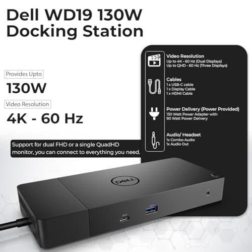 Paquete de estación de acoplamiento Dell WD19 – Base Dell con adaptador de corriente de 130 W + cable HDMI + cable DisplayPort + cable USB-C + paño de microfibra incluido (renovado)