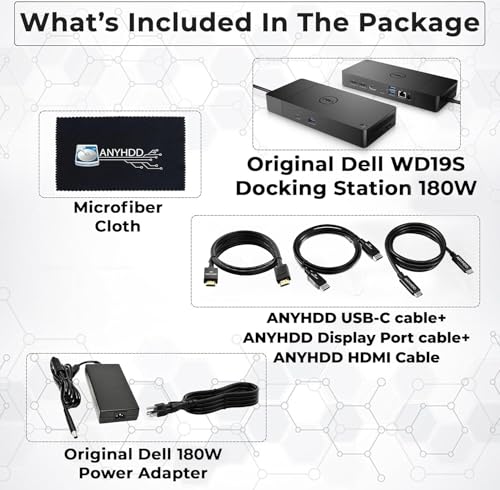 Especificaciones: Paquete de estación de acoplamiento Dell WD19S con monitor doble, 180 W, compatible con pantalla 4K, base Dell con fuente de alimentación de 180 W + cable HDMI 4K Anyhdd + cable DisplayPort 4K + cable USB-C + paño de microfibra incluido