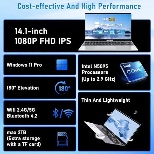 Especificaciones: Portátil para juegos de 14 pulgadas, computadora portátil 2025 Win 11 Pro, 16 GB de RAM 1 TB SSD, procesador N5095 de 11ª generación (hasta 2.9 GHz), FHD 1920 x 1080, BT 4.2