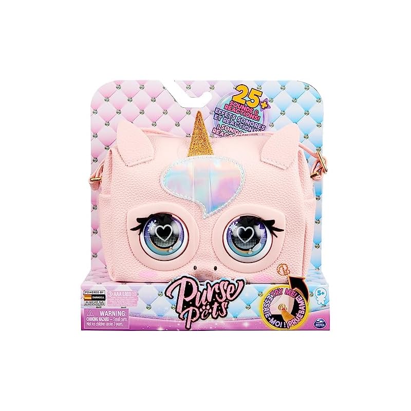 BOLSO NIÑA Y MASCOTA INTERACTIVA: el peluche interactivo de Purse Pets con un cuerno brillante, el charol iridiscente, la piel sintética rosa texturizada, la correa ajustable y varios accesorios de metal, el bolso para niña Unicornio Purse Pet es la mascota y el accesorio de moda definitivo. ¡Colecciona todos los modelos de bolsos para niñas Purse Pets