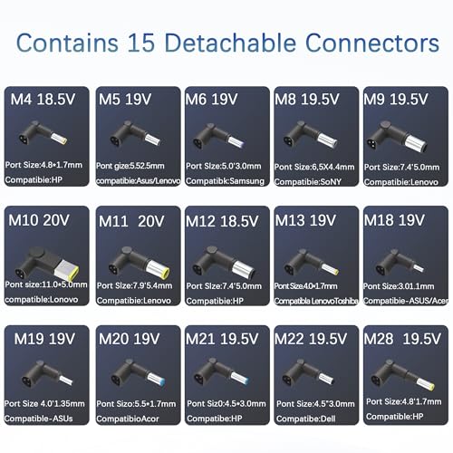 Amplia compatibilidad: este adaptador universal para laptop viene con 15 puntas intercambiables, por lo que es adecuado para la mayoría de laptops, ultrabooks y Chromebooks. Es compatible con marcas populares como Dell, HP, Acer, Asus, Lenovo, IBM, Sony, Fujitsu, Gateway y más. Siempre que el conector de tu portátil coincida con una de las 15 puntas incluidas, este adaptador funcionará perfectamente para ti.