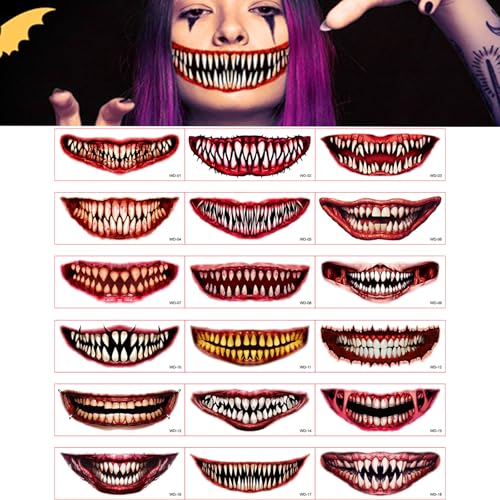 Qpout 18 piezas Tatuajes de cara de Halloween, tatuajes temporales de maquillaje de broma de Halloween para adultos, Calcomanías de tatuajes de boca grande de payaso aterrador