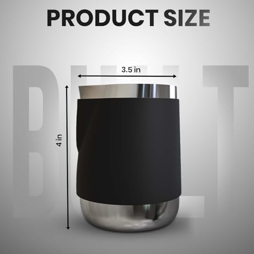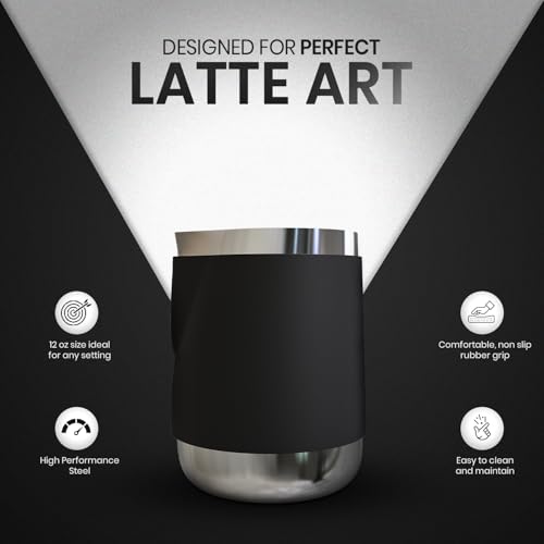Especificaciones: Rattleware Jarra de acero inoxidable con mango de 12 onzas, con mango de goma, duradera y resistente al calor, jarra de espuma de leche para baristas, cafeterías y cafeterías