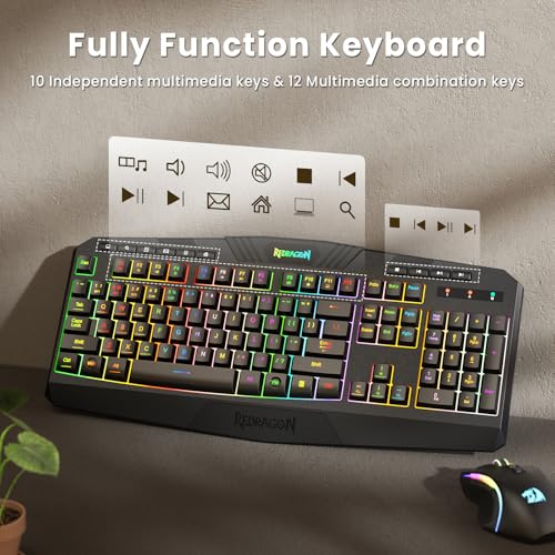 Teclado totalmente funcional: el teclado inalámbrico Redragon S101M-KS está equipado con 10 teclas multimedia independientes y 12 teclas multimedia combinadas para garantizar una gestión rápida durante los juegos. También tiene resistencia a salpicaduras, función de bloqueo WIN y viene con un cable USB-C desmontable de 6 pies