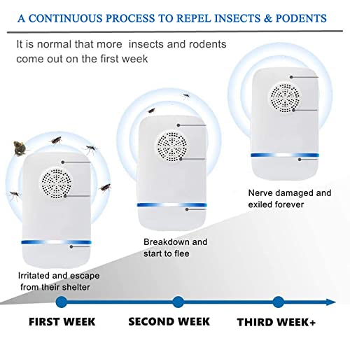 Seguro y amigable: tecnología ultrasónica avanzada. Este dispositivo es respetuoso con el medio ambiente, no tóxico e insípido, sin productos químicos, 100% seguro y sin ruido para niños, mascotas y mujeres embarazadas. Se puede utilizar con seguridad en el hogar y ahuyenta eficazmente las plagas. Tarda de 3 a 4 semanas en hacer efecto.