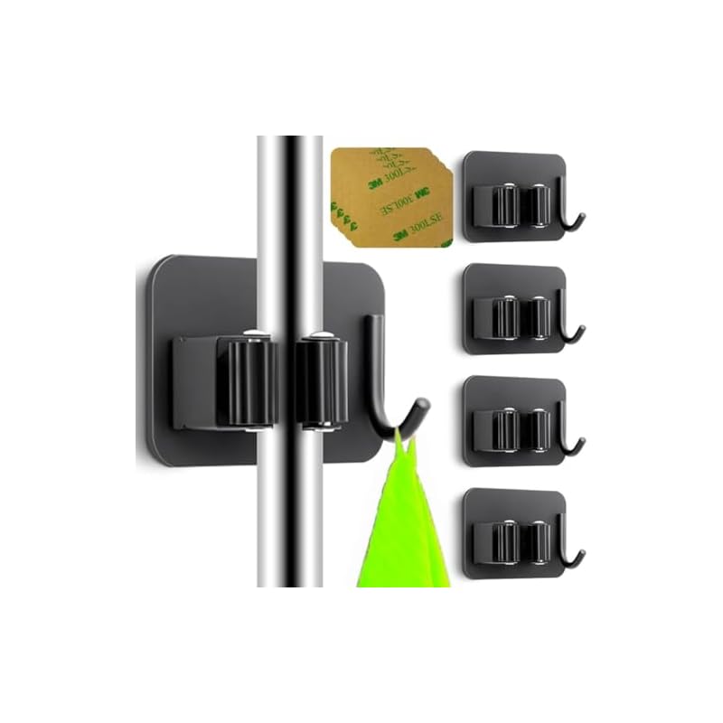 Mantén tu hogar organizado con nuestro set de 4 soportes de escobas y fregonas adhesivos de alta calidad, diseñados para simplificar la organización y maximizar el espacio en tu hogar. Este set incluye 4 colgadores de color negro, cada uno equipado con un gancho adicional para colgar el recogedor, lo que lo convierte en un organizador de escobas y fregonas de pared ideal para cualquier entorno.