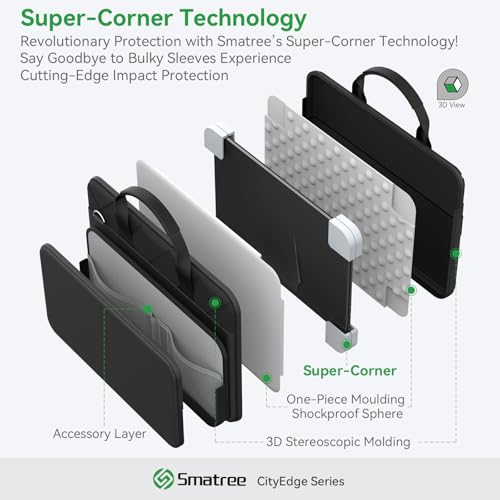 Diseño patentado; Protección completa: Los puntos de absorción de golpes se distribuyen dentro de la bolsa para reducir el impacto externo, compartimento de PC integrado con el diseño patentado «Super-Corner» para resistir la colisión y el apretón, protege de forma segura la computadora portátil. El bolsillo externo para accesorios en el exterior evita impactos, agua y arañazos, proporciona una protección completa para tu portátil y accesorios