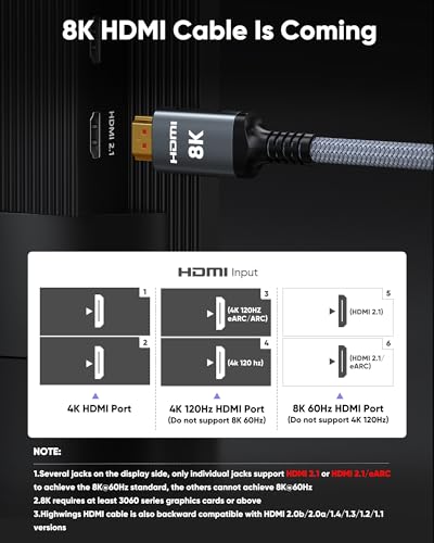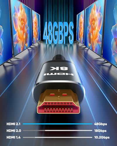Cable UHD HDMI 2.1: cumple con la versión estándar HDMI 2.1 más reciente y caracteriza por 3 veces la velocidad de transmisión más que Ultra HD 4K, menos retraso, atascado y parpadeo. Este cable HDMI también es compatible con versiones HDMI 2.0b/2.0a/1.4/1.3/1.2/1.1