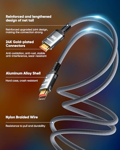 Diseño duradero: el diseño de resistencia flexible SR, los puertos chapados en oro de 24 quilates y el nailon extensible de grado militar pueden garantizar que este cable HDMI de 8 K resista hasta 25,000 tiempos de flexión y transmite señales con precisión, extendiendo en gran medida la vida útil
