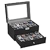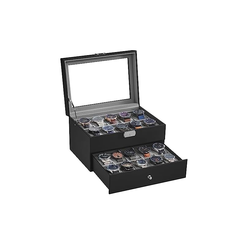 [2 niveles, gran capacidad] Esta caja para relojes de 2 niveles con 20 ranuras (10 ranuras por nivel) ofrece mucho espacio para tus relojes con un tamaño de pantalla de hasta 48 mm. Además, puedes quitar las almohadillas para guardar tus joyas