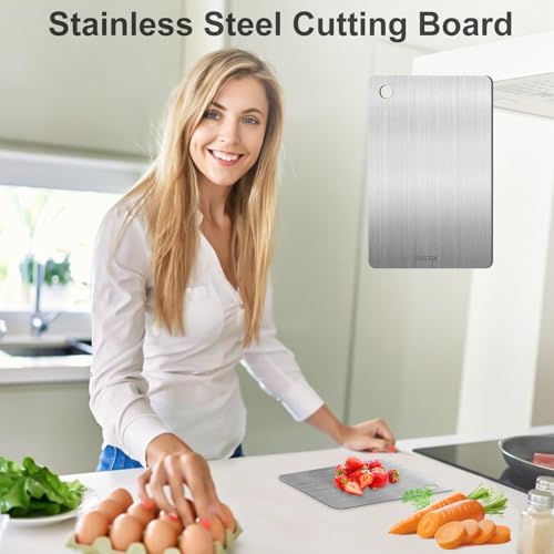 Almacenamiento Perfecto: Nuestras tablas de cortar de titanio presentan un diseño elegante y simple, para que pueda disfrutar de una encimera ordenada y una sensación elegante, es fácil de colgar cuando no está en uso y organiza perfectamente el espacio de su cocina