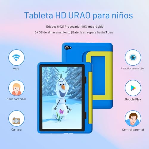 【NUEVA EDICIÓN TABLET INFANTIL DE 10 PULGADAS CON FUNDA INCLUIDA】Última versión tablet infantil de 10» para niños de 6-12. URAO Kids Tablet está equipado con el último sistema operativo Android 14.0, que es más seguro y rápido que las versiones anteriores de Android y también puede eliminar anuncios no deseados. Además, nuestra tableta para niños adopta un procesador de ocho núcleos de 2.0 GHz que es un 40% más rápido que el procesador normal en frecuencia básica. 8 GB de RAM, 64 GB de ROM e incluye una ranura para tarjeta micro SD, puedes ampliar fácilmente el espacio de almacenamiento hasta 1 TB con una tarjeta micro SD (no incluida). ¡El gran espacio de almacenamiento permite a los niños disfrutar de un mundo en línea de alta velocidad!