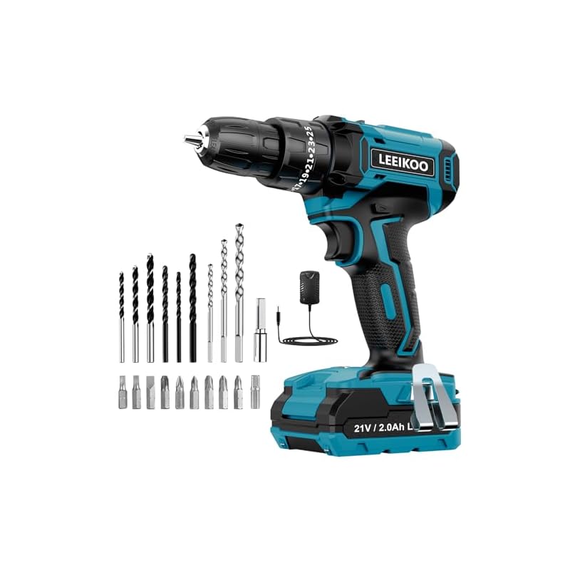 Especificaciones: Taladro Percutor a Bateria 21V, LEEIKOO Taladro Atornillador Bateria, 42N.m Atornillador Electrico con BaterÃa 2.0Ah, 25+3 Ajuste de Par, 24 Accesorios, 2 Velocidad, LED Luz Para Hogar, Bricolaje