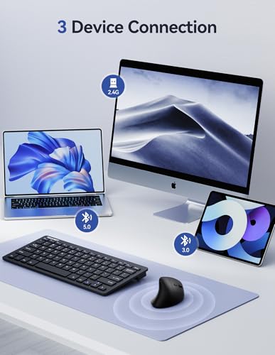 Conectividad de tres dispositivos: este mouse vertical cuenta con tecnología inalámbrica 2.4G y Bluetooth dual (BT5.0 y BT3.0), lo que permite la conexión simultánea a tres dispositivos. Cambia fácilmente entre tu computadora, laptop y tablet con solo pulsar el botón inferior, aumentando tu productividad