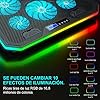 【Luces RGB Envolventes】 La base de refrigeración portatil tiene tiras de luz RGB en todos los lados. Una vez que se enciende el soporte de refrigeración para portátil, puede distribuir un efecto de iluminación RGB genial. Hay 10 tipos de modos de iluminación, puede elegir luces de respiración de colores o el modo de luz de respiración monocromática según sus preferencias. Es muy guay y hermoso cuando juegas.