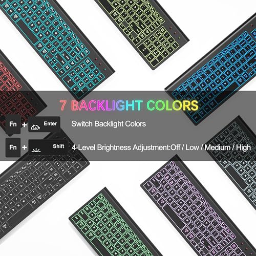 [Retroiluminación de 7 colores y estable 2.4G inalámbrico] Este teclado inalámbrico cuenta con 7 efectos de retroiluminación conmutables con niveles de brillo apagado/bajo/medio/alto, lo que te permite personalizar fácilmente la iluminación para adaptarse a tus necesidades. Las teclas iluminadas permiten un trabajo eficiente incluso con poca luz, mientras que los efectos de iluminación ayudan a mejorar su ambiente de trabajo. El juego de teclado y mouse garantiza una conexión inalámbrica estable de hasta 32.8 ft. con un receptor Nano compartido y un adaptador tipo C para conectar y usar instantáneamente.