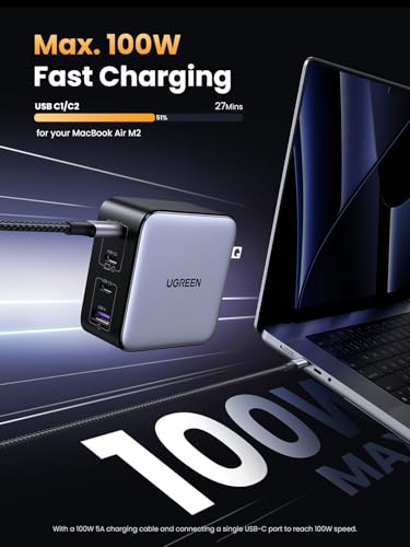 Carga rápida máxima de 100 W: Conecte un solo dispositivo USB C para hasta 100 W de potencia, soporte máximo de corriente de 5 A, cargue el MacBook Air M3 al 55% en menos de 30 minutos con este adaptador de cargador para portátil. NOTA: Con un cable de carga de 100 W y 5 A y conectando un solo puerto USB-C para alcanzar una velocidad de 100 W