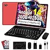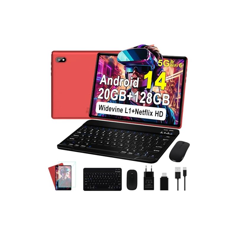 UJJ Tablet 10 Pulgadas Android 14 Tablet Octa-Core, 20GB RAM + 128GB ROM (1TB TF), 5G+2.4G Dual Band WiFi 6, Bluetooth 5.0, 5MP+8MP, Widevine L1, HD IPS, Facciale ID, Tablet con Teclado y Raton – Red