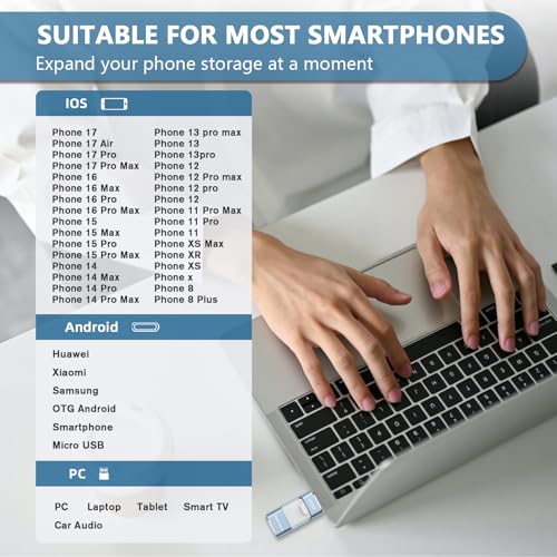 Copia de seguridad de alta velocidad y un clic: experimente hasta 80 MB/s de lectura y velocidad de escritura de 40 MB/s, y fotos, videos y documentos se pueden copiar en la unidad flash de 512 GB con un solo clic. La tarjeta de memoria del teléfono proporciona una forma simple y rápida de transferir fotos y videos. Le permite liberar la memoria de su dispositivo móvil sin usar un cable de datos o iCloud. Con este palo de fotos para teléfono, ya no tienes que preocuparte por el almacenamiento del teléfono. Facilita la transferencia de archiv
