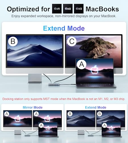 [Compatible con Mac M1/M2/M3] – Esta estación de acoplamiento para laptop es más potente y estable con los puertos de conectividad, admite monitores triples para MacOS y Windows, y doble monitor sin espejo gastado. Puede ampliar el escritorio de su computadora portátil a pantallas dobles o triples a la vez para aumentar la productividad del trabajo y el estudio, lo que le permite comenzar una vida más inteligente.