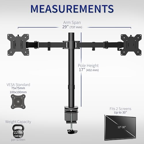Se adapta a pantallas de 13 a 30 pulgadas – Soporte de monitor dual que se adapta a dos pantallas de 13 a 30 pulgadas de tamaño y hasta 10 kg de peso cada una con orificios de montaje traseros VESA de 75 x 75 mm o 100 x 100 mm. Los clips de gestión de cables se proporcionan a lo largo de los brazos y el poste central.