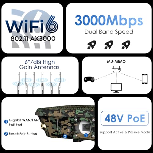 Especificaciones: WAVLINK AX3000 Punto de acceso WiFi para exteriores con PoE, nuevo modelo 2025 repetidor inalámbrico para exteriores de largo alcance, doble banda 2.4G+5G, antenas de alta ganancia 6x7dBi, IP67 resistente a la intemperie, funciona con Starlink, Greenwood