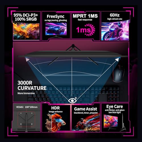 ZZA Monitor curvo de 32 pulgadas 4k, pantalla de computadora 60HZ 4k UHD (3840 x 2160P) Panel VA 3000R, monitor de juegos 4K AMD Freesync, 100% sRGB HDR10 Instalaciones de montaje en pared (HDMI 2.0